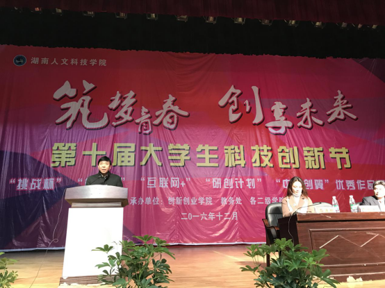 石潇纯介绍了第十届科创节的筹备以及学校今年参加各类创新创业赛事的组织情况;随后,美术与设计学院肖巧云同学代表竞赛团队发言,她带领的团队获得今年第二届“互联网+”大学生创新创业大赛国赛三等奖;接着,挑战杯决赛评委娄星区科技局副局长李健代表评委团庄严承诺公正评判。