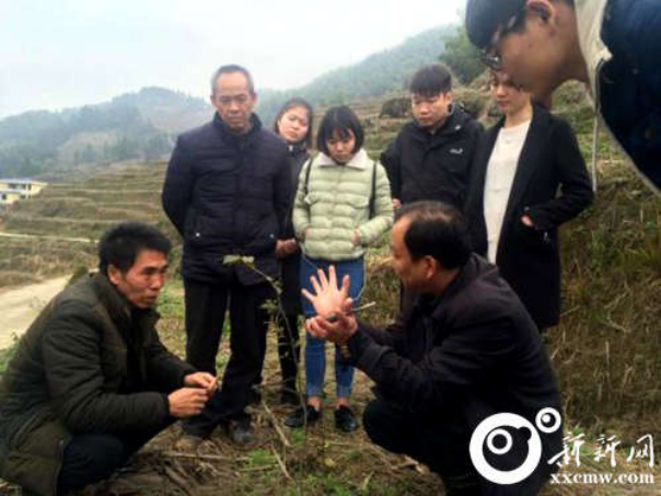 高级农艺师康林峰(前右二)现场传授油茶树的栽培技术