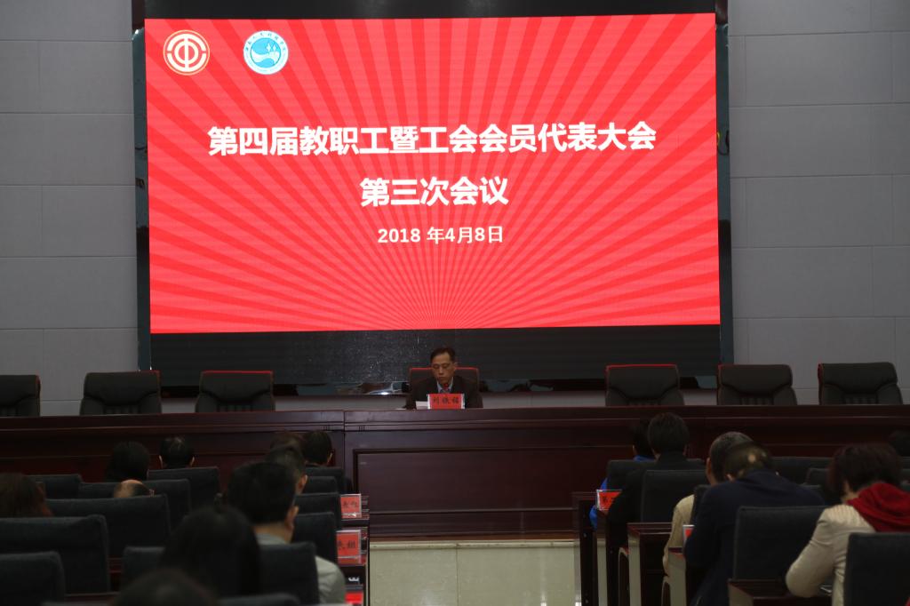 4月8日下午,beat365第四届教职工暨工会会员代表大会第三次会议在图书馆第二会议室召开。103名正式代表、38名列席代表参加了会议。校党委副书记刘铁铭主持会议。