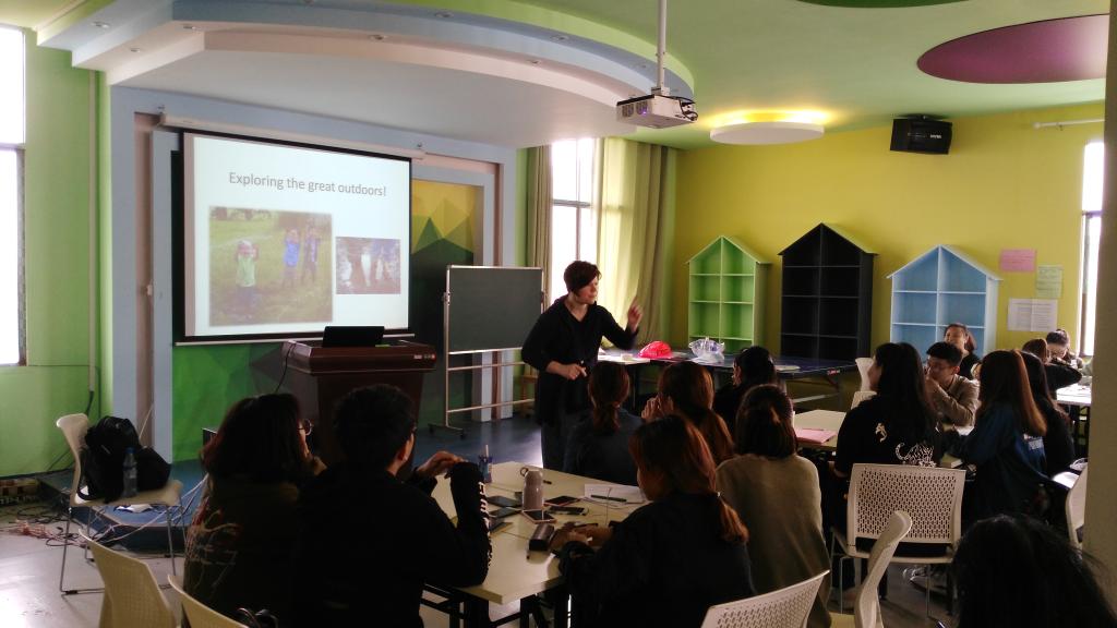 4月26日,学前教育(中英合作)项目中的英方教师Alyson博士应beat365的邀请,在甘澍楼601开展一堂“Exploring the great outdoors”的校级公开课,该课程为《 beat365英国官网与英国巴斯斯巴大学合作举办学前教育专业本科教育项目》英方课程《学前教育活动设计》的一部分。副校长陈志国、校教学督导、各学院的教研室主任、新进教师和教育学院全体教师参与听课。课后,陈志国和督导团的专家们和Alyson、Rebecca两位博士一同探讨了课堂教学的内在思路,深度理解这一引发学生探究的体验式教学模式,这为beat365课堂教学改革提供一个新的思路。