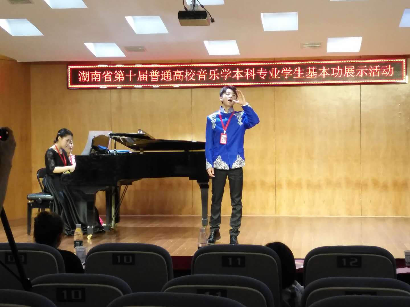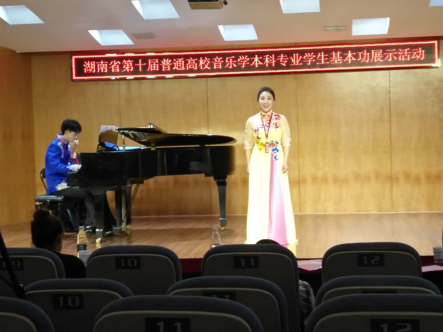 高校音乐学本科专业学生基本功展示活动俗称五项全能比赛,分为钢琴演奏、自弹自唱、歌唱与钢琴伴奏、合唱指挥以及微课展示,体现出学生全面的专业与综合素质,活动由省教育厅组织举办,每两年举行一次,旨在推动我省普通高校音乐学本科专业教学改革,提高人才培养质量,本届活动由湖南城市学院承办,全省包括湖南师范大学在内的18所院校参加,参加比赛活动的学生前期由各个学校提供2015级音乐学专业所有学生名单,4月16日集中在湖南城市学院抽签确定参赛学生人选,学生的确定具有完全的随机性与偶然性,活动主要考察各个学校的日常办学质量和办学成效。展示活动从确定比赛学生到具体比赛,时间只有25天,时间紧,准备项目多,训练任务繁重,本次比赛在教务处直接领导和大力支持下,经过我院周密的工作部署和比赛师生团队紧张激烈的赛前准备和训练,最终取得了令人满意的比赛成绩,反映了音乐舞蹈学院近年通过深化教学改革,狠抓教学质量管理,取得了很好的成效。