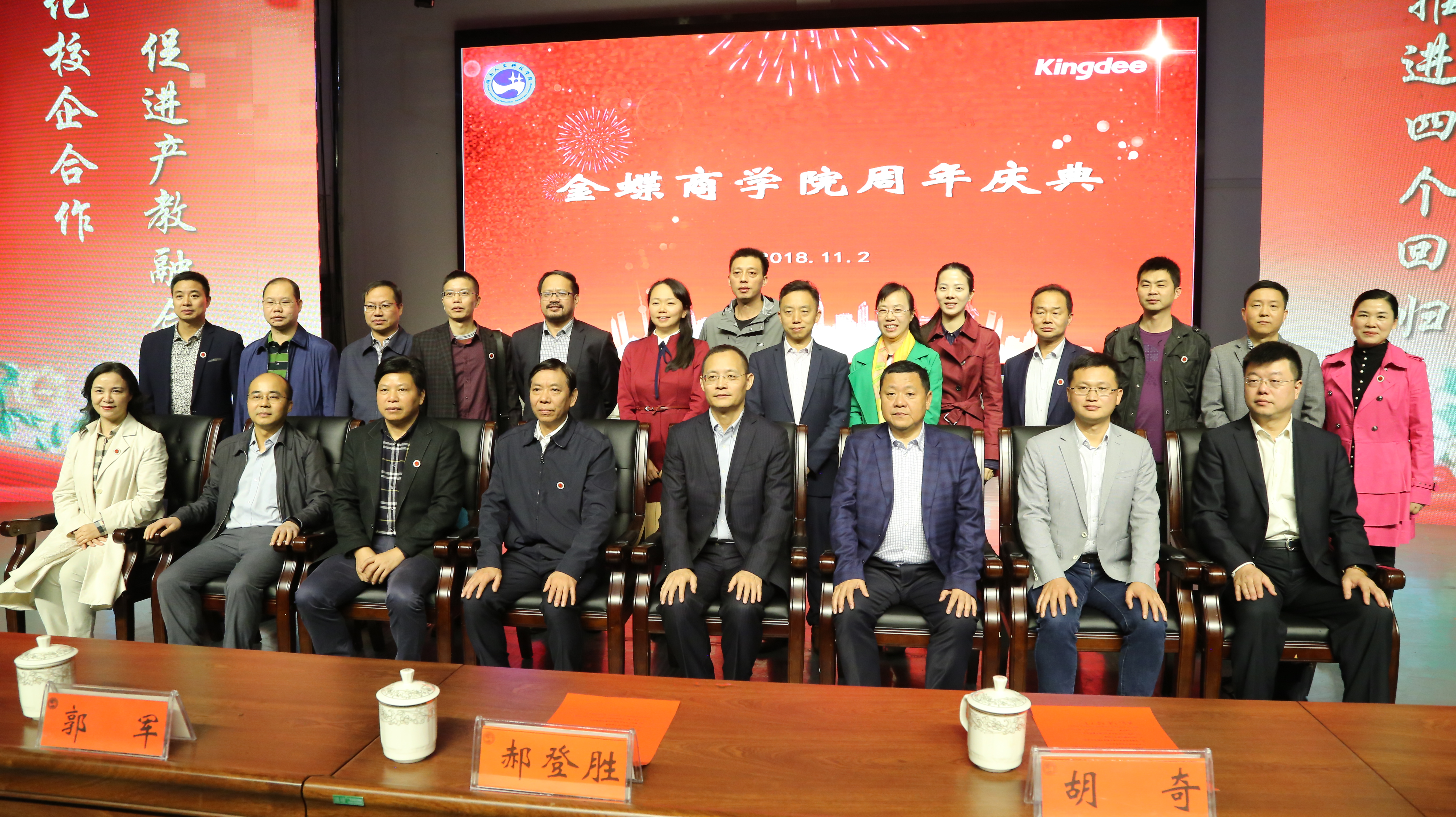 11月2日上午,beat365首家行业学院“金蝶商学院”周年庆典在逸夫楼音乐厅举行。学校党委书记郭军、校长刘和云、副校长石潇纯,金蝶集团副总裁郝登胜、湖南金蝶总经理胡奇、副总经理谢锋、金蝶顾问学院院长陈跃等出席庆典。学校教务处、计划财务处、校地校企合作处等部门负责人,各二级学院负责校地校企合作的院领导,商学院全体党政领导、教师及17级全体学生一同参加了本次活动。