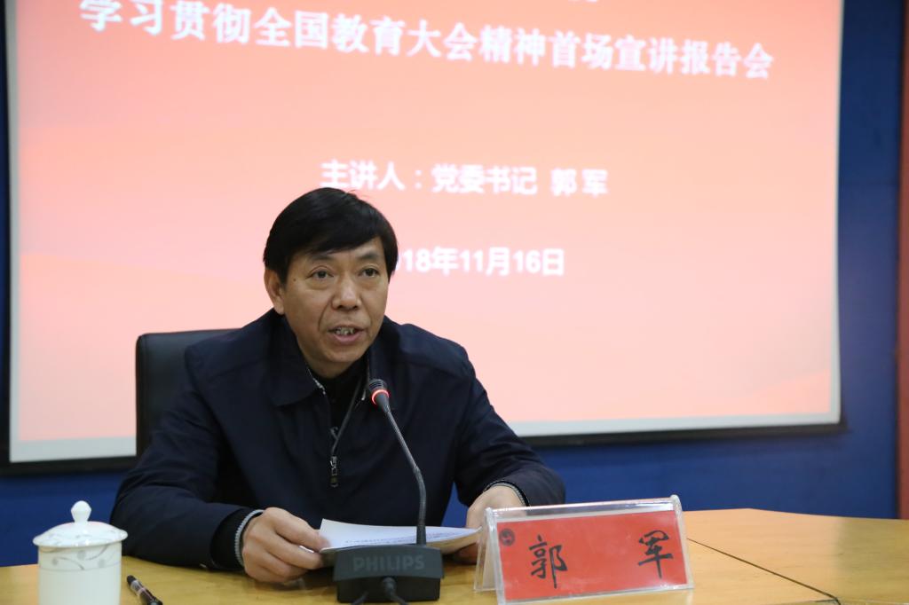 会上,郭军作《深入学习贯彻全国教育大会精神,努力开创学校教育事业发展新局面 》的主题报告,他回顾了全省学习宣传贯彻全国教育大会精神首场宣讲报告会的重要内容,介绍了蒋昌忠厅长的报告要求,并从全面理解全国教育大会重大意义、深刻领会习近平总书记关于教育的重要论述、扎实推进加快教育现代化的重点任务、切实抓好学习贯彻落实四个方面进行宣讲。