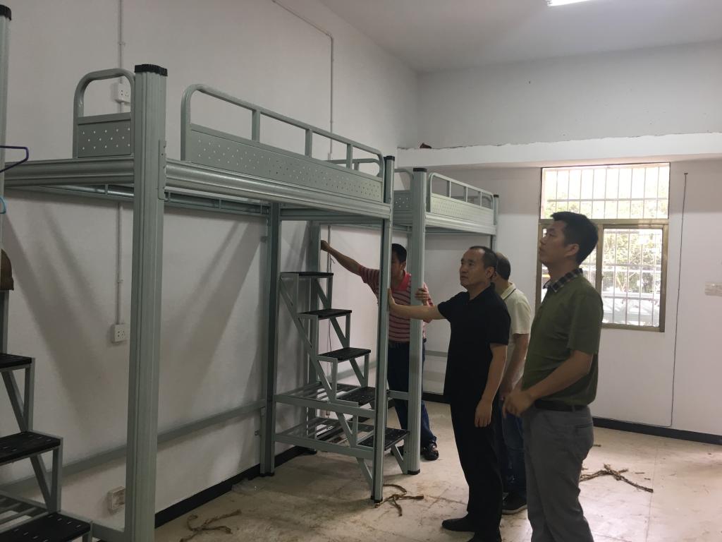 刘铁峰详细查看了改建宿舍上床下桌的板材和床架材料质量,要求对板材的厚度和床架的钢结构厚度进行检测度量,指示国资、学工等部门严把质量关,严格按照招标合同要求进行验收。随后,他在现场逐层查看了寝室内新床的安装情况,详细询问了施工进度和施工质量情况,对床桌安装不合理、不便利的地方提出了具体的整改意见,并明确要求学工处和国资处派专人负责督促中标公司限期整改到位。