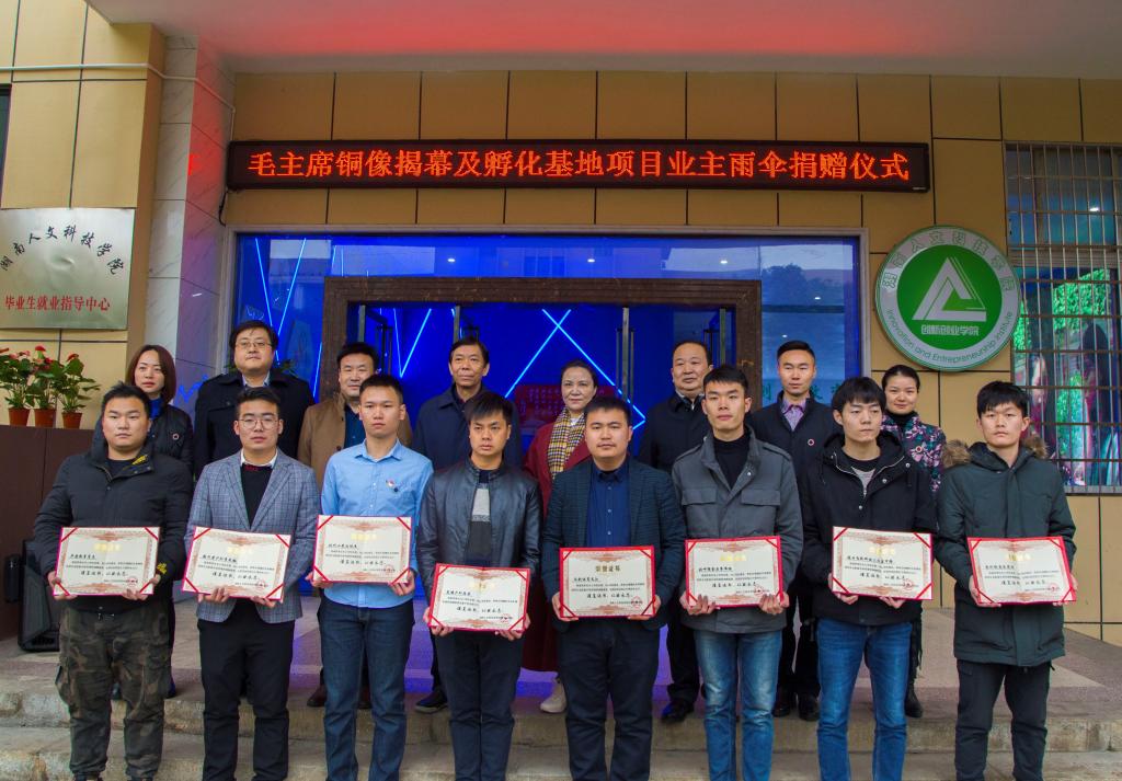 随后,郭军、石潇纯等共同为毛主席铜像揭幕。创新创业学院院长彭晓华向文江、陈宸、刘冰杰等9名捐赠者颁发了捐赠证书。