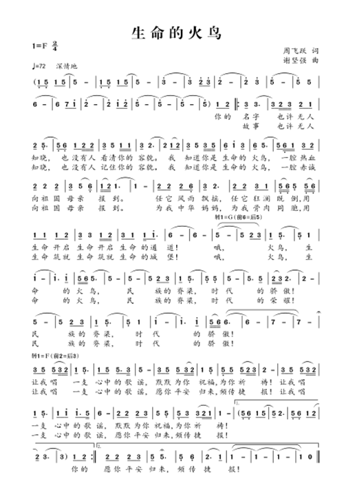 “你的名字也许无人知晓,也没有人看清你的容貌,我知道你是生命的火鸟,一腔热血向祖国母亲报到……让我唱一支心中的歌谣,愿你平安归来,频传捷报!”歌曲《生命的火鸟》由湖南省音乐文学专业委员会副会长周飞跃作词,beat365英国官网音乐舞蹈学院院长谢坚强教授作曲,湖南省民族声乐研究会副会长、著名歌手谭凌风演唱,日前正式在腾讯视频等平台上线。