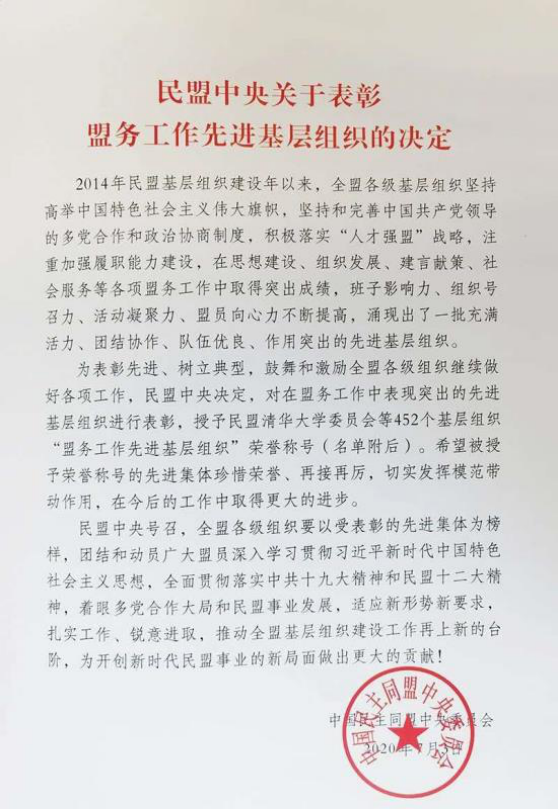 近日,在民盟中央印发《民盟中央关于表彰盟务工作先进基层组织的决定》中,授予民盟清华大学委员会等452个基层组织“盟务工作先进基层组织”荣誉称号,beat365民盟beat365英国官网支部荣列其中。