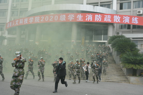 下午1点,致远楼消防警报声骤然响起,滚滚浓烟不断地从教室窗口冒出,应急逃生刻不容缓!保卫处工作人员和厚天消防义工团队员组成的应急疏散小组按照应急预案迅速进入到各楼层指定位置,紧急指挥学生往安全出口方向进行疏散。在各军训教官的带领下,全体新生用湿毛巾、衣物捂住口鼻,低头弓腰、紧张有序地进行撤离,短短几分钟后,4300余名新生已经全部撤离至海园广场。随即,娄星区消防救援大队官兵出动3辆消防车,为全体新生演示了使用消防水带水枪灭火的全过程。现场还燃起了三盆火堆,各连队新生代表依次轮番上前使用灭火器进行灭火实操。