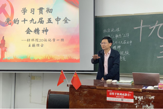 为了深入学习贯彻十九届五中全会精神,把思想和行动统一到全会精神上来,11月11日晚,材料与环境工程学院2020级新生在致远楼晚自习教室开展“关于学习党的十九届五中全会精神”的主题班会。党委委员、副校长陈志国,计划财务处副处长王卫一,国际合作与交流处副处长黄敏等领导来到新生班级参加主题班会,与同学们面对面交流,指导同学们更好的学习十九届五中全会精神。
