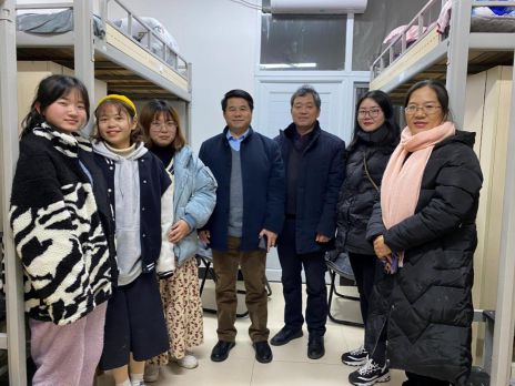 周发明在寝室和学生们亲切地拉起了家常。老家在哪里?学什么专业?生活习惯不习惯?学习压力大不大?老师的话能不能听懂?天气转凉了,冷不冷?今后对于职业有什么规划?……