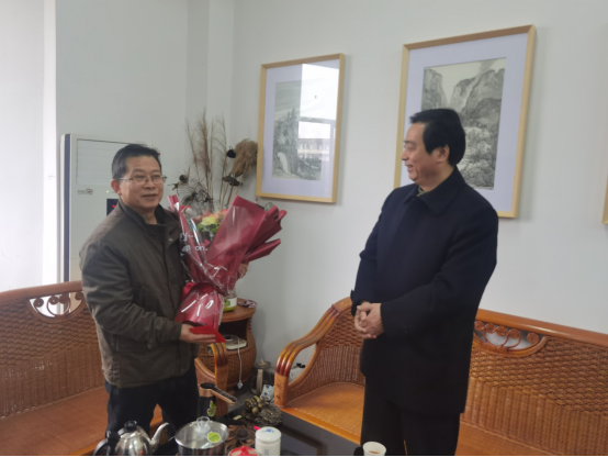 2月8日上午,娄底市委常委、市委宣传部部长吴建平一行来beat365,在学校党委委员、宣传统战部部长谢柳的陪同下前往逸夫楼215工作室看望慰问了中国美术家协会会员、娄底著名国画画家、美术与设计学院教授邹少灵。