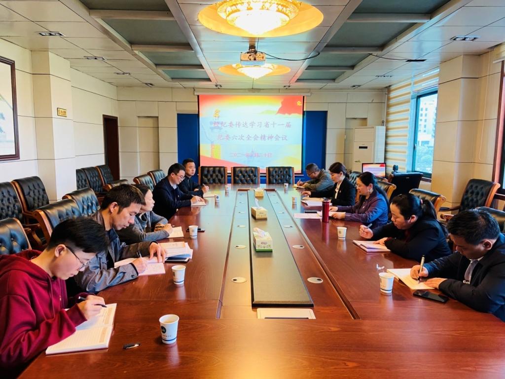 凌艳平传达学习了省纪委十一届六次全会精神,重点传达学习了省委书记、省人大常委会主任许达哲在省纪委十一届六次全会上的重要讲话精神和省纪委常务副书记、省监委副主任许忠建代表省纪委常委会作的工作报告。会议指出,许达哲书记的讲话深入分析了我省全面从严治党新形势新特征,为推动全面从严治党向纵深发展,确保实施“三高四新”战略、建设现代化新湖南开好局起好步作了全面部署,对领导干部涵养清风正气、永葆忠诚干净担当政治本色提出明确要求。随后,凌艳平深刻解读了六次全会中的10个关键词,并围绕许忠建副书记工作报告中的2021年全省纪检监察8个主要任务对学校纪检监察工作进行了全面安排部署。