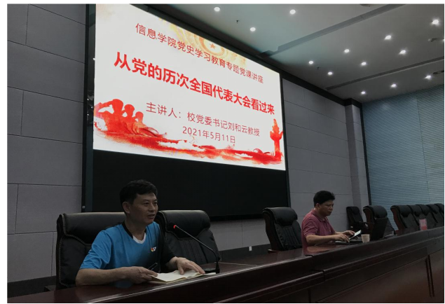 5月11日,校党委书记刘和云教授在图书馆第二会议室为信息学院党员做了题为“从党的历次全国代表大会看过来”的党史学习教育辅导报告。信息学院140名党员参加,信息学院党总支书记谭甲凡主持报告会。