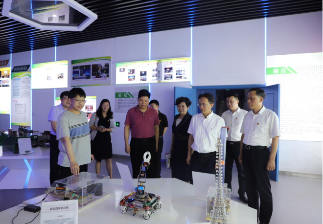 座谈会后,王副厅长一行到创新创业学院进行了实地走访调研,在双创学院展厅参观了学生创新创业的成果。(图/文 宣传部)