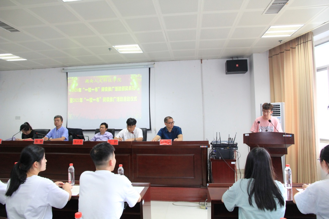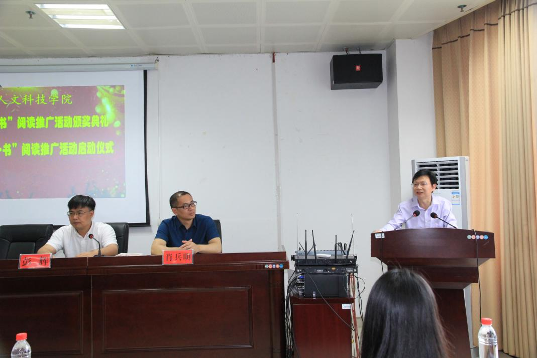 在党史学习教育进入第三专题“学史崇德”之际,为推动学校学风建设,提升师生阅读素养,引导师生养成熟读深思、学思并进的读书习惯,大力弘扬先进文化,传承红色基因,厚植爱国主义情怀,建设书香校园,以“学史崇德,‘读’领风骚”为主题,5月11日下午,beat365在图书馆报告厅举行了2020年“一校一书”阅读推广活动颁奖典礼暨2021年“一校一书”阅读推广活动启动仪式。校党委委员、副校长陈志国出席,宣传统战部、团委负责人及部分二级学院党总支书记参加。启动仪式由图书馆党支部书记、馆长彭辉主持。