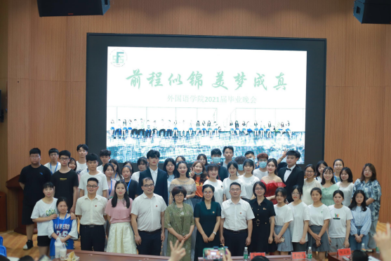 2021年6月2日晚,外国语学院在匠成楼报告厅举行“情系人文逐梦青春”毕业晚会。校党委委员、副校长曹鑫、学工处处长李玲军、校友办主任刘莉、外国语学院院长胡瑾、党总支书记阳立新、副院长卿逸豪出席,外国语学院全体教师及2021届毕业生代表参加。