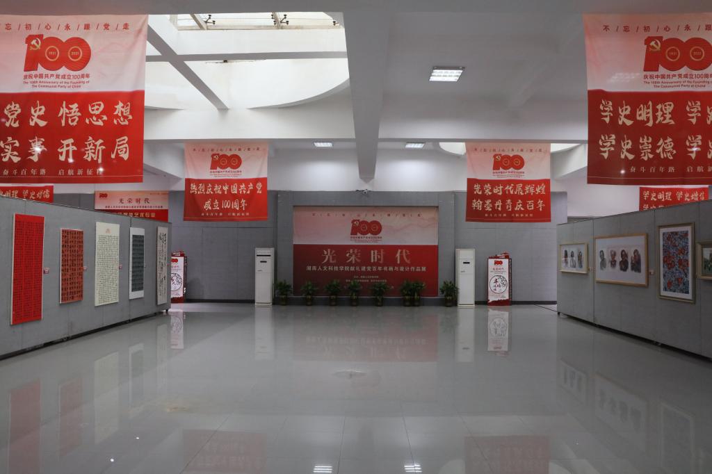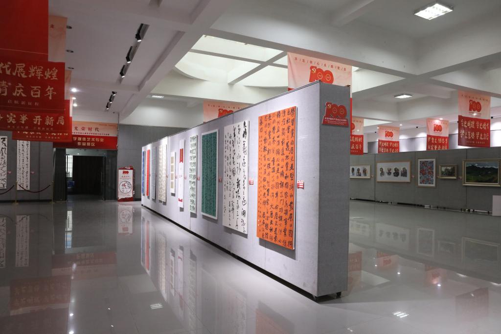本次作品展由宣传统战部与美设院联合举办,分为四大版块:峥嵘岁月、丰功伟绩、伟人诗词、美好生活。其中,书法作品25幅,美术作品15幅,摄影作品10幅,动画作品2件,设计作品8件。展出作品覆盖美设院全部专业,院长陆序彦领衔,师生积极参与创作。书法作品或以魏晋而书,或以唐楷畅怀,笔走龙蛇间饱含着对党和领袖的无限敬仰;美术作品或以皴擦写意,或以工笔白描,彩绘丹青中展现革命红色岁月和生机盎然的神州大地;摄影作品或拍摄名胜记录祖国的大好河山,或按下快门永恒瞬间,光影交汇里展示美好生活;动画及设计作品或再现革命先辈来时路,或描绘百年征程奋斗史,精彩创意下共同回忆峥嵘岁月。