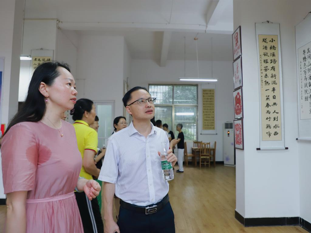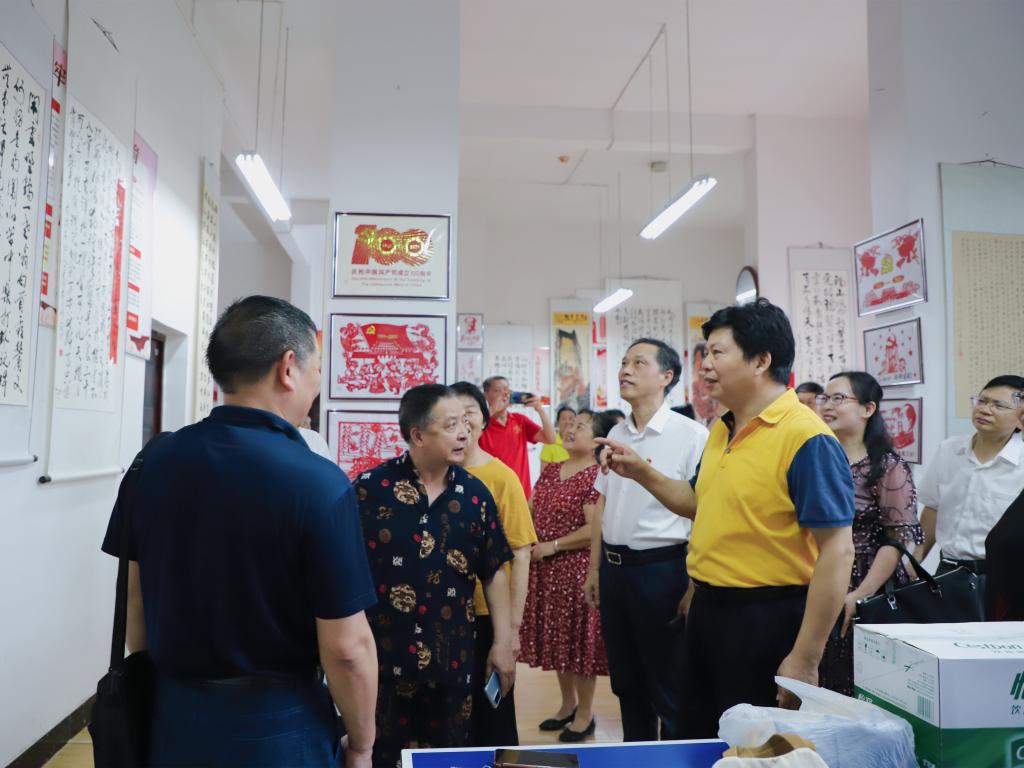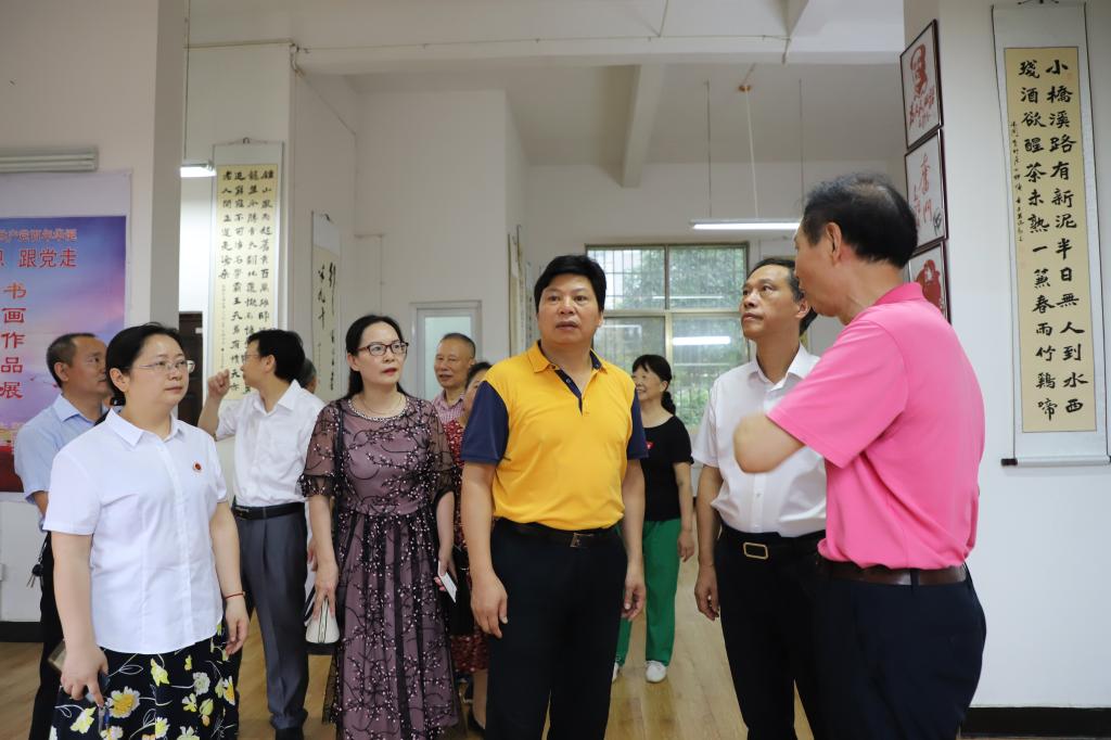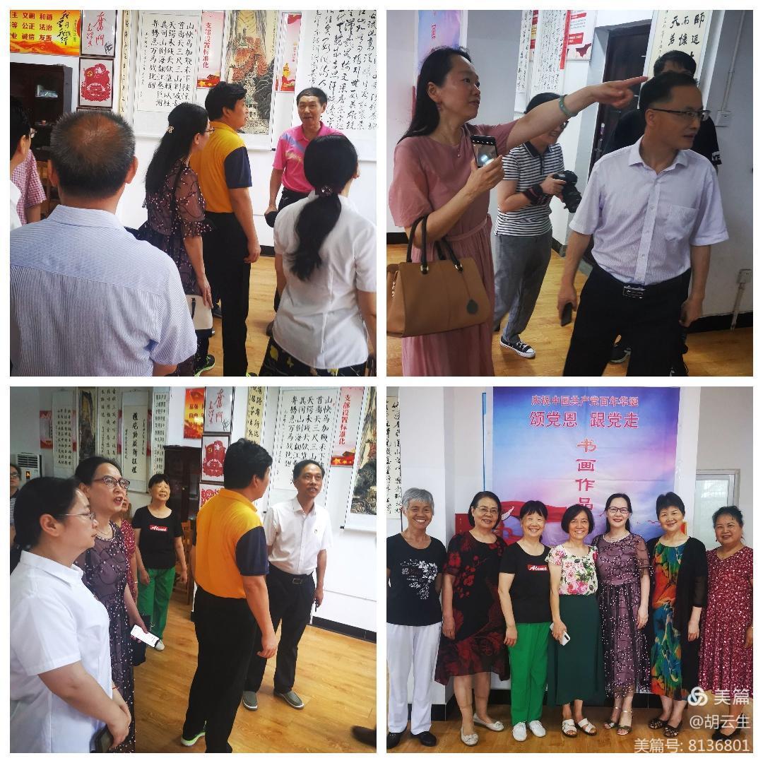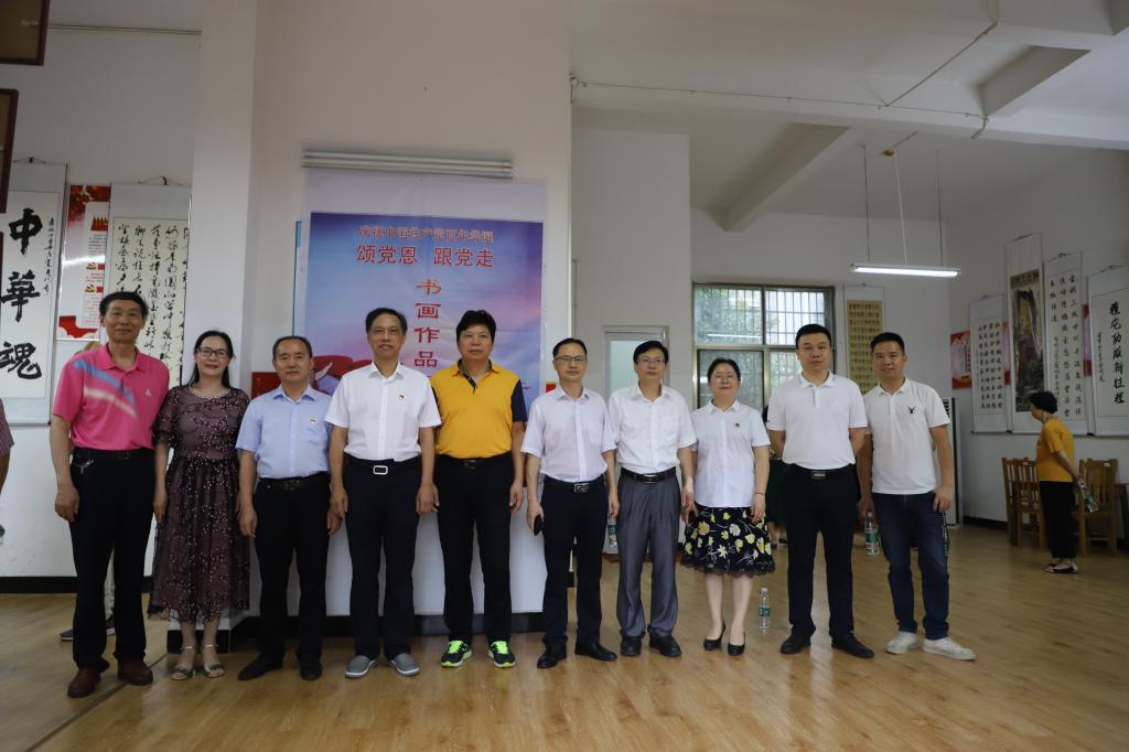 为庆祝中国共产党成立100周年,大力弘扬中华民族优秀传统文化,进一步丰富校园文化生活,离退办党总支于6月28日上午在离退第六党支部活动室隆重举行"颂党恩 跟党走"书画作品展开展仪式。校党委书记刘和云、校长刘铁铭和全体在家校领导一起参观了书画展,对展览的筹划工作及作品的质量给予了充分的肯定。