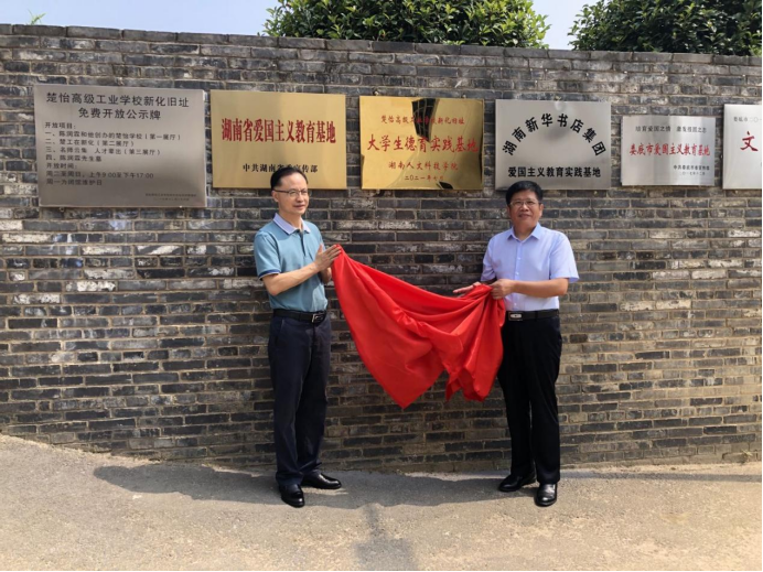 在楚怡高级工业学校新化旧址门口,李军林与新化县文化旅游广电体育局党组副书记、局长刘新平共同揭牌。