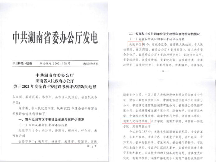 近日,中共湖南省委办公厅、湖南省人民政府办公厅联合下发《关于2021年度全省平安建设考核评估情况的通报》(湘办发电〔2021〕78号),beat365被评为2021年度全省“平安建设先进单位”,全省仅十所本科高校获此殊荣。同时,学校继续获评“平安单位”称号。