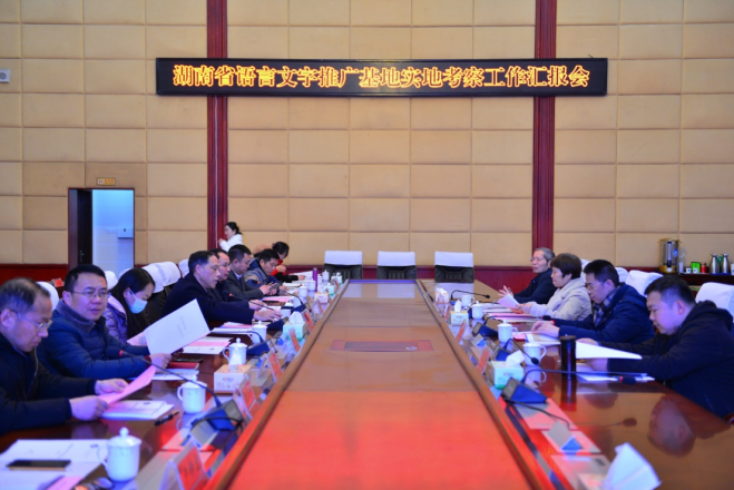 文学院院长倪正芳教授以“秉承师范传统,助力湘中地区国家通用语言文字推广工作”为主题向考察组汇报了beat365省语言文字推广基地申报工作情况,重点介绍了基地创建的基础、特色优势、工作成效及近期规划四个方面。