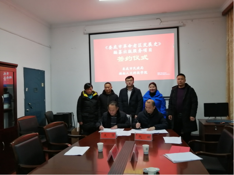 近日,以刘红梅等文学院教师为核心团队的《娄底市革命老区发展史》编纂出版服务项目签约仪式在明德楼218会议室举行。副校长朱强、娄底市民政局副局长赵焕出席,市民政事务中心主任胡题欧、校地校企合作处处长于意、文学院院长倪正芳等参加会议。
