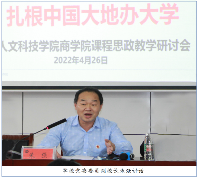 4月26日,学习习近平总书记考察中国人民大学讲话精神暨商学院课程思政教学研讨会在高韵楼101召开。党委委员、副校长朱强出席,教务处、马克思主义学院、商学院主要负责人以及教师代表80余人参加。研讨会由商学院副院长杨怀宏主持。