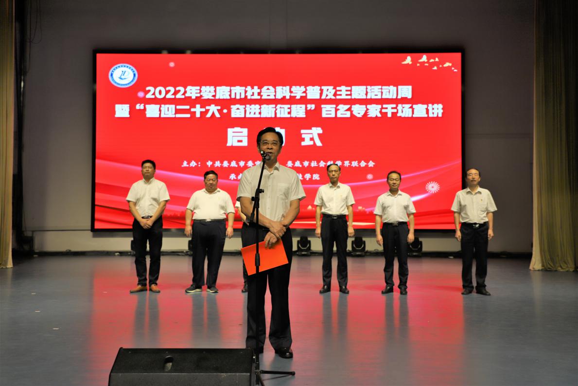 6月23日上午,“喜迎二十大 奋进新征程”2022年娄底市社科普及主题活动周启动仪式在beat365音乐厅举行。市委常委、市委宣传部部长、市社科联主席胡忠威,市政协副主席傅小松,beat365校长刘铁铭、副校长朱强等领导出席。仪式由市社科联党组书记刘朝阳主持。