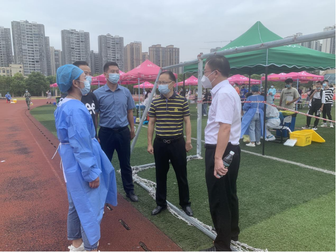 学校党政高度重视,校长刘铁铭、党委副书记李军林等校领导到现场指导检查。防控办、党政办、团委、学工处、人事处、保卫处等部门通力合作,不到3个小时即完成检测。采样点设学校田径场,支援采样的为娄底市中心医院医护人员。在现场,所有人自觉佩戴口罩,间隔1米,井然有序排队等候检测,检测后按照规定路线返回。医护人员和志愿者身着防护服,佩戴口罩、面屏和医用一次性手套,严格按照检测规范流程进行信息登记、核对、核酸采样。