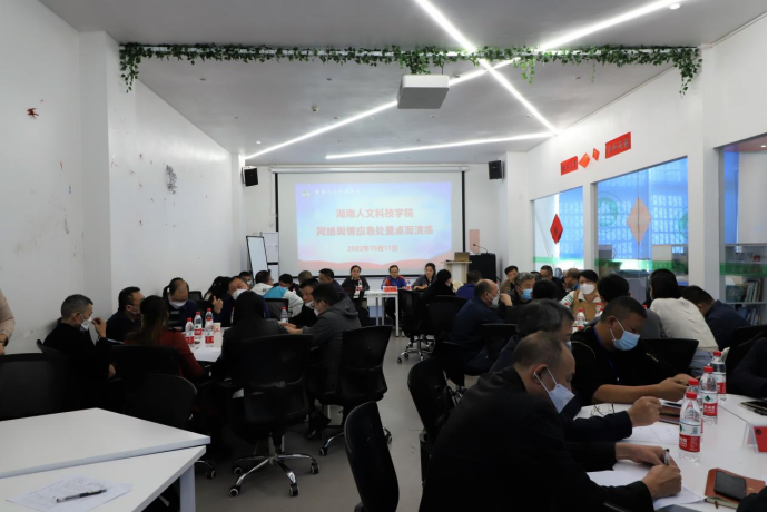 为贯彻落实习近平总书记关于“建设网络强国”的指示精神,进一步提升学校各级部门网络舆情应急处置能力,防范化解网络舆情领域风险隐患,筑牢学校网络安全“防火墙”,10月11日,学校首次网络舆情应急处置桌面推演在匠成楼路演厅开展。宣传统战部副部长陈璐主持,职能部门主要负责人,二级学院党总支书记和学工办主任参加。校党委副书记李军林出席并讲话。