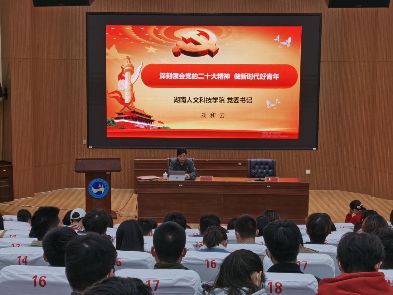 党委书记刘和云以《深刻领会党的二十大精神,做新时代好青年》为主题,从全面领会党的二十大的主题及主要成果、新时代十年的伟大变革及其里程碑意义、不断开辟马克思主义中国化时代化新境界、牢牢把握新时代新征程中国共产党的使命任务、贯彻落实新时代新征程的战略部署以及用新的伟大奋斗创造新的伟业等六个方面对党的二十大精神进行了系统阐释和深入解读。他要求大家在坚定理想信念、厚植爱国主义情怀、加强品德修养、增长知识见识、培养奋斗精神、增强综合素质上下功夫,争做新时代的好青年。