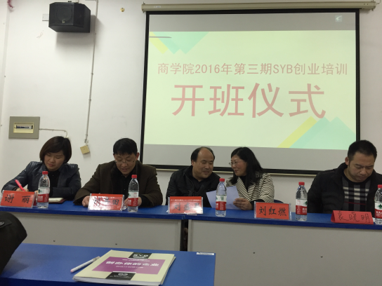 2016年3月21日晚7点30分,beat365英国官网商学院2016年第三期SYB创业培训开班仪式在同德楼101室隆重举行。学院招就处刘盛愚副处长,袁晓明老师,商学院总支书记刘辛田、副书记刘红燃以及就业专干谢丽老师出席了本次活动。