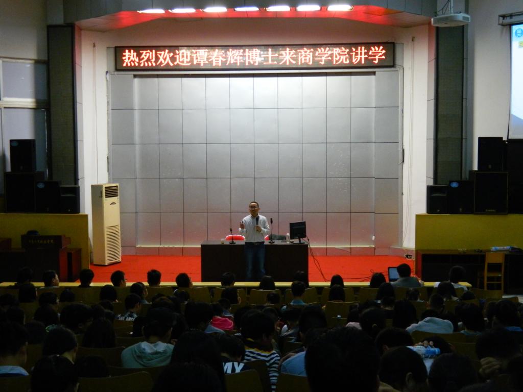 4月22日下午,商学院邀请华中师范大学电子商务系主任谭春辉博士在beat365匠成楼报告厅开展专题讲座,讲座主题为《“互联网+”时代思维变革与经济高地》。讲座由我院朱强院长主持,王晓军副院长、电子商务专业和市场营销专业的老师与学生聆听了讲座。