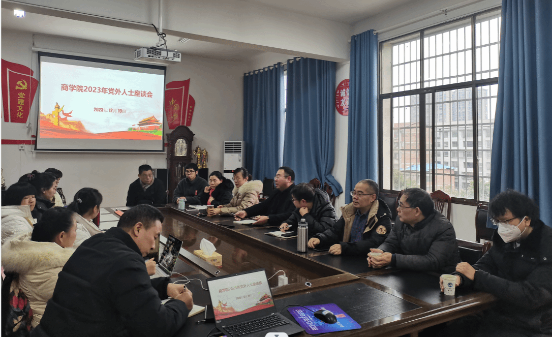 2023年12月19日下午,商学院高韵楼309召开党外人士座谈会,全体院领导、党总支委员、民主党派、无党派人士参加会议。会议由党总支书记刘辉主持。