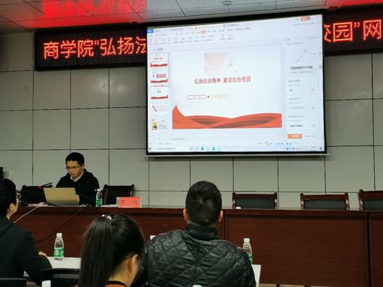 41日晚上,商学院在高韵楼101举办了法制教育专题讲座。隆回县司法局贺礼警官应邀做了“弘扬法治精神,建设法治校园”的主题报告,党总支副书记胡益龙主持,商学院全体辅导员、2020级班主任和2020级团支书与寝室长参加了讲座。
