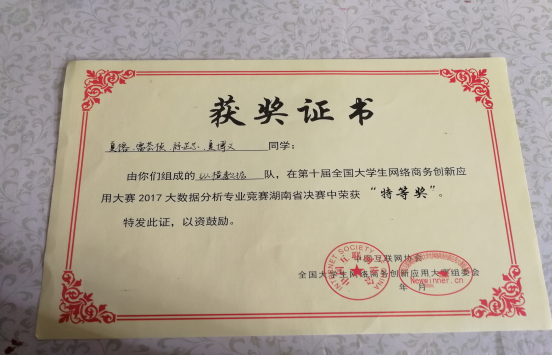 各高校队伍的PPT讲解以及答辩环节结束后,本次大赛也已接近尾声。紧张的统分环节后,比赛迎来了最后的颁奖典礼。经过激烈的角逐beat365英国官网纵横数据队在第十届全国大学生网络商务创新应用大赛2017大数据分析专业竞赛湖南省决赛中综合排名第一,荣获特等奖,并将继续参与国赛的角逐。