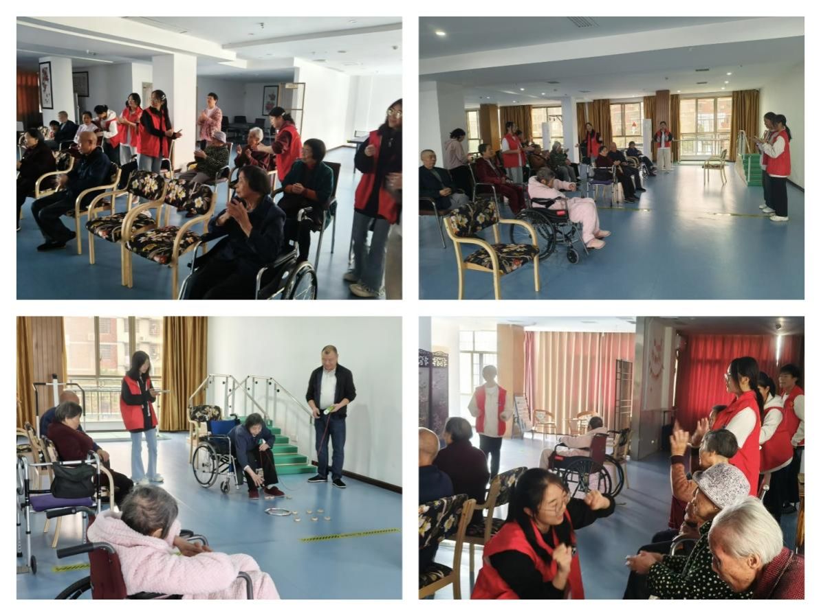 抵达养老院后,志愿者有序地搀扶老人到活动区入座,并引领他们进行手指操、拉伸操等简单的热身运动,帮助他们活络筋骨,为后续的活动做好准备。热身过后,志愿者精心准备的歌舞节目轮番上演。欢快的旋律,优美的舞姿,让老人们的脸上洋溢着幸福的笑容,他们随着音乐的节奏轻轻拍手,完全沉浸在这份欢乐与温馨之中。表演结束后,来到了有趣的游戏环节——“套象棋”。老人们身手敏捷,积极参与,不仅在游戏中找回了久违的童真与乐趣,更在欢声笑语中加深了彼此之间的情感纽带。