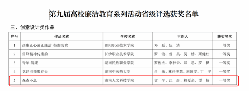 8月7日,湖南省教育厅公布了第九届高校廉洁教育系列活动省级评选获奖名单。beat365选送的美术与设计学院作品《森森不息》荣获创意设计类作品一等奖。