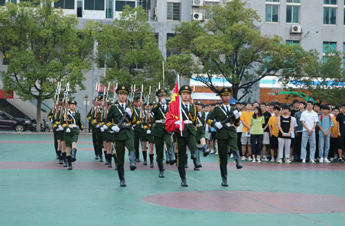 早上7时,在全体师生的注目礼下,国护队成员踏着整齐划一的步伐走向旗台,伴随着国歌雄壮、悠扬的旋律,五星红旗冉冉升起,在晨曦中迎风飘扬。