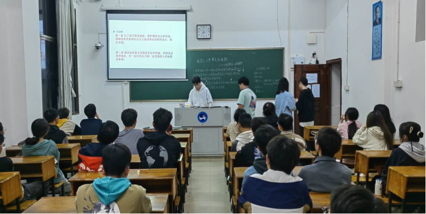 团课开始,主持人带领同学们认真学习《保密法》及相关法律知识,增强同学们的保密意识和法律意识;然后团课主持人提问并与台下同学互动探讨国家秘密的具体范围,使同学们认识到保护国家秘密的重要性;最后观看与保密相关的情景剧,进一步提高同学们的社会责任感以及同学们对保密工作的自觉性。