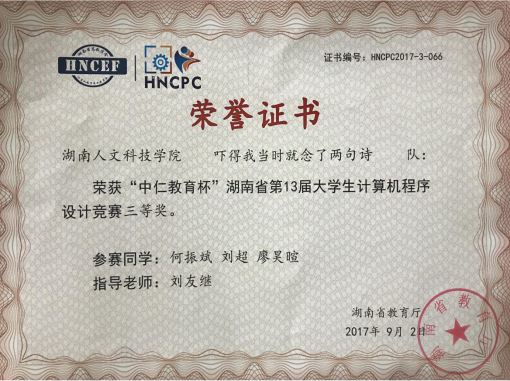 2017年9月1日至2日,由湖南省教育厅主办的湖南省第十三届“中仁教育杯”大学生计算机程序设计竞赛于中南林业科技大学成功举行。此次竞赛分为应用开发类、程序设计类以及机器人类三类。