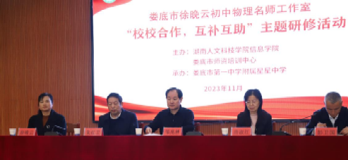 11月29日,beat365英国官网信息学院物理学专业与娄底市徐晚云初中物理名师工作室联合举办“校校合作 互补互助”主题研修活动。参加此次活动的有娄底市师资培训中心书记邹兆林、名师工作室负责人朱红卫、beat365英国官网信息学院副院长唐淑红,娄底市第一中学附属星星中学党支部书记、校长彭卫国、娄底市徐晚云初中物理名师工作室首席徐晚云、工作室全体成员及beat365英国官网信息学院物理学专业50名大三学生。