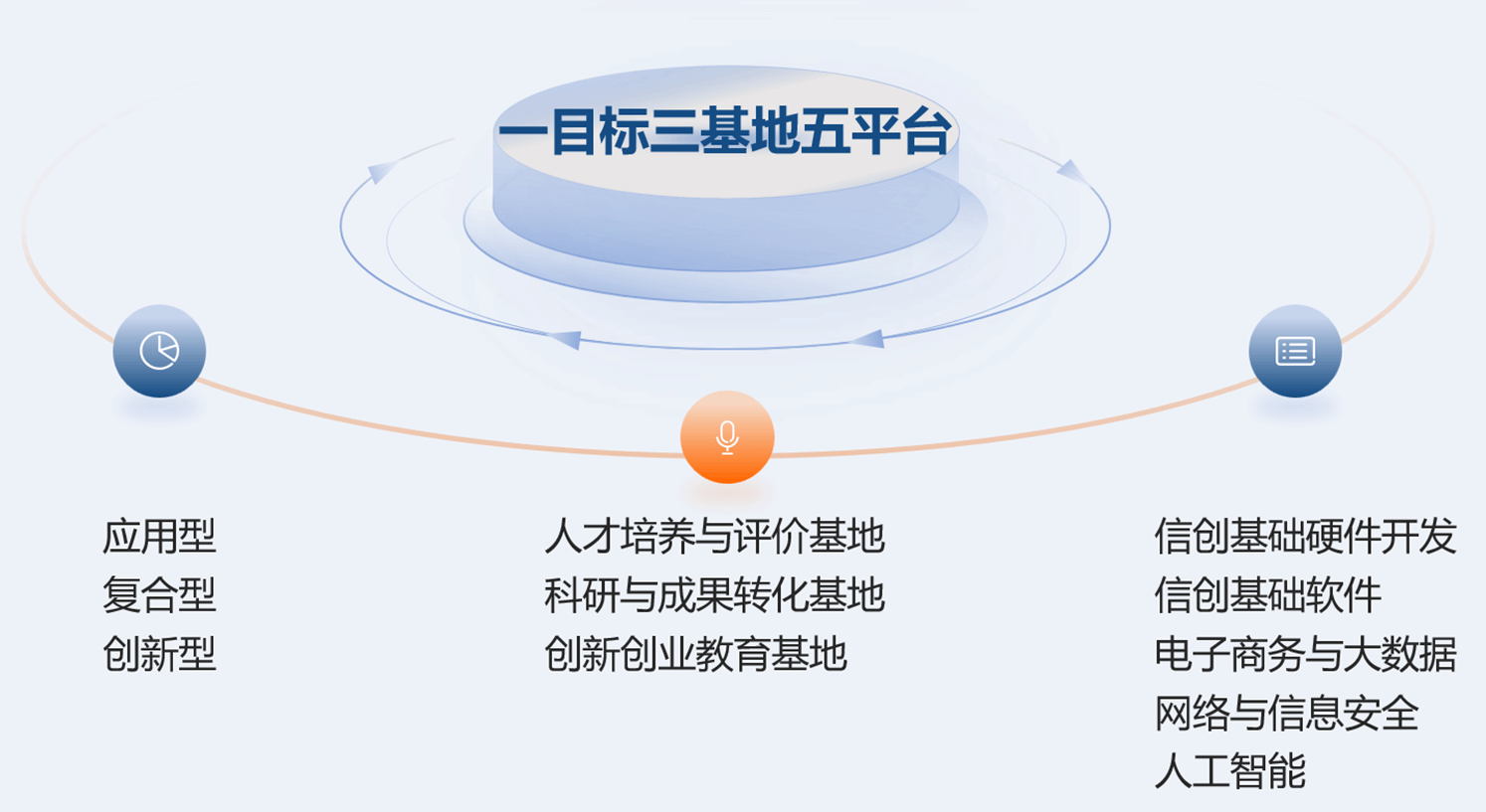 按照“一目标、三基地、五平台”定位,校政企联合搭建产教融合示范性人才培养综合平台。“一目标”就是紧盯应用型、复合型、创新型信创人才培养目标;“三基地”就是着力建设人才培养与评价基地、科研与成果转化基地、创新创业教育基地;“五平台”就是加快构建信创基础硬件开发、信创基础软件、电子商务与大数据、网络与信息安全以及人工智能等信息技术应用创新和服务平台。