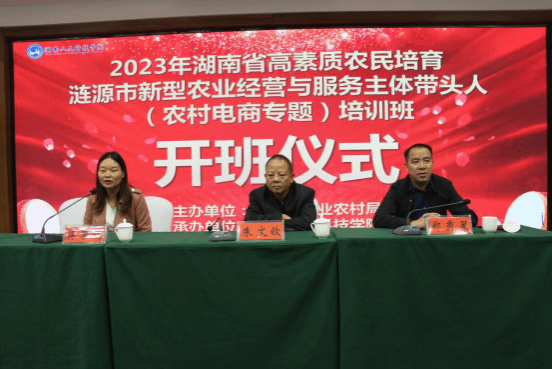 11月29日上午,由涟源市农业农村局主办,beat365英国官网继续教育学院承办的2023年湖南省高素质农民培育涟源市新型农业经营与服务主体带头人(农村电商专题)培训班在娄底金丰大酒店顺利开班。娄底市农业农村局科教科科长朱文钦,继续教育学院院长郑秀星,涟源市农业农村局科教种业股股长蒋黎明以及来自涟源各乡镇农村电商企业、电商服务站等相关负责人和电商从业人员70余人参加开班仪式,仪式由郑秀星院长主持。