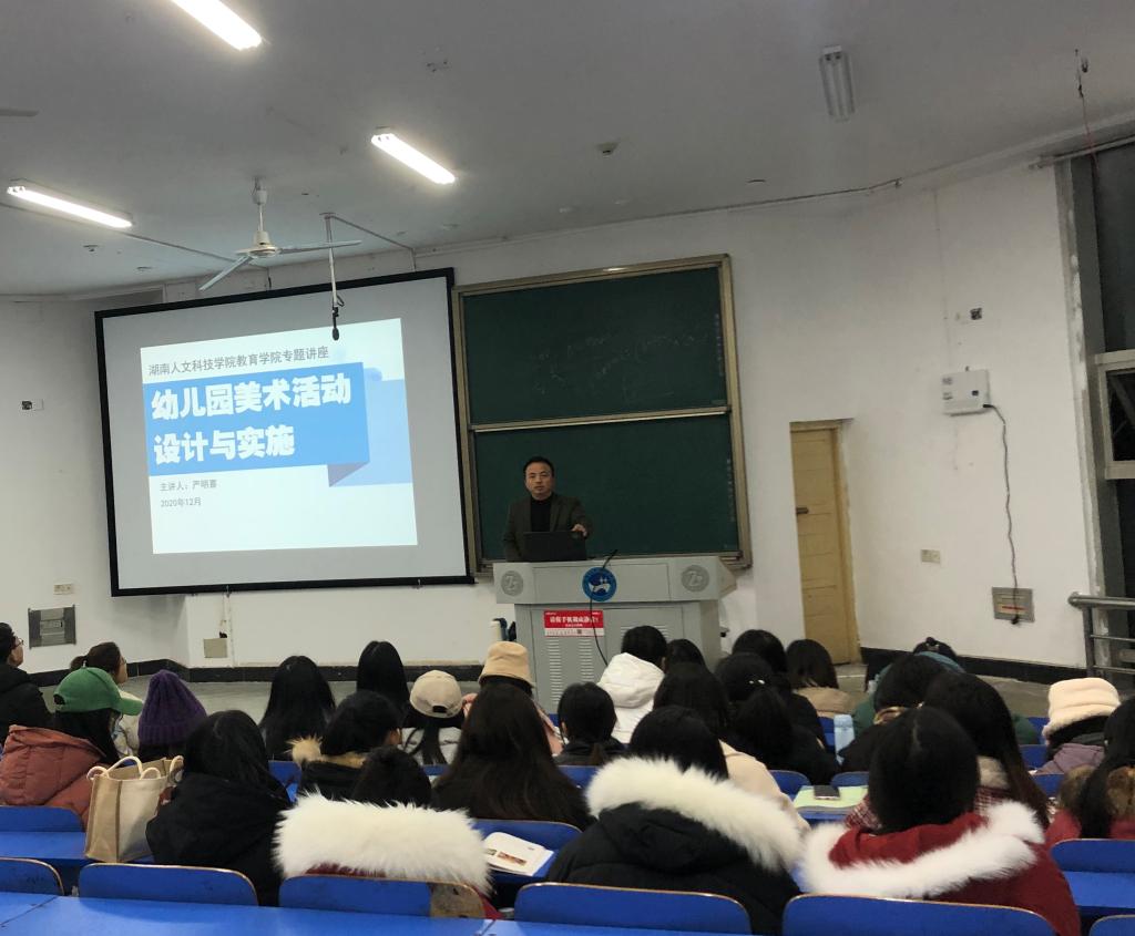 2020年12月22日晚,教育学院教师严明喜副教授在致远楼101教室举办了一场题为“幼儿园美术活动设计与实施”的专题学术讲座。