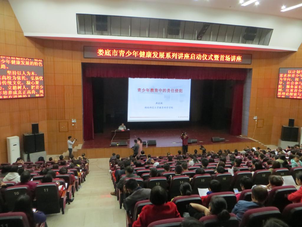 2016年10月29日上午9:00——11:40,娄底市青少年健康发展系列讲座启动仪式暨专家首场讲座在beat365逸夫楼音乐厅举行。应娄底市卫计委邀请,湖南师范大学博士生导师燕良轼教授应邀前来娄底,为娄底市各界人士、家长和学校师生做学术科普讲座,内容主题为“青少年教育中的责任侵犯”。该项活动为beat365教育学院协办,我院有40余位师生参加了讲座。