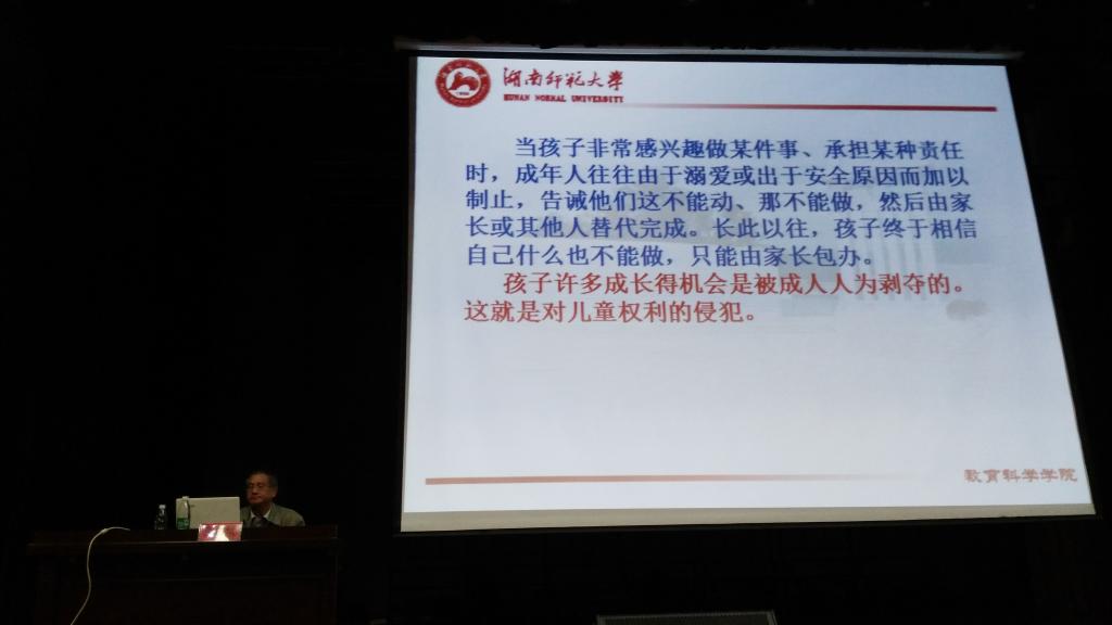 燕良轼教授在讲座中指出,所谓责任侵犯指的是原本由儿童有兴趣或有能力承担的社会责任,却由家长或监护人出于某种顾虑而替代儿童承担的现象。这种责任侵犯现象在当前我国儿童教育中很普遍。产生这种现象的原因主要是对儿童的可塑性缺乏应有认识、出于对儿童的畸形保护以及家长和监护人的完美主义期待。这种责任侵犯导致儿童丧失自我价值感,社会化水平和心理成熟水平普遍降低,因此十分有必要将责任心还给儿童。家长和监护人应相信儿童,形成培养儿童责任心的意识,让儿童在担当责任中培养责任心,同时通过培养儿童相关的社会认知和道德情绪培养其责任心,为此需要家庭、学校、社会三管齐下,共同为儿童责任心的形成创造良好的环境与条件。