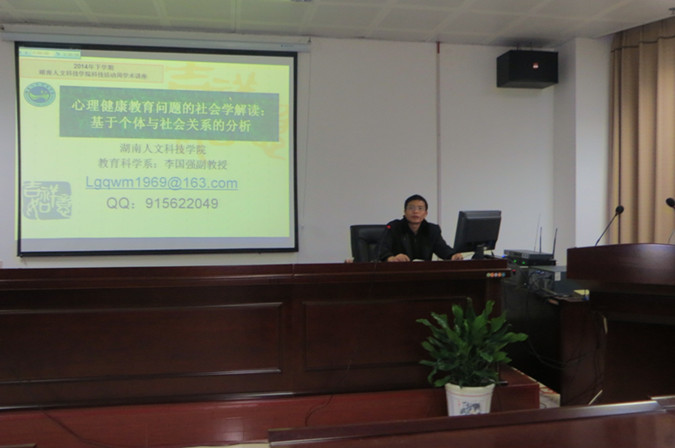 为配合学校本学期“学术活动周”工作,2014年12月23日晚上7:00——9:00,教育科学系在学校新图书馆415多媒体报告厅举办了一场学术讲座,主讲人为李国强副教授,讲座主题为:“当代心理健康问题的社会学解读”。教育系应用心理学专业大一、大二学生和学校各系部部分师生约200人参加了报告会。