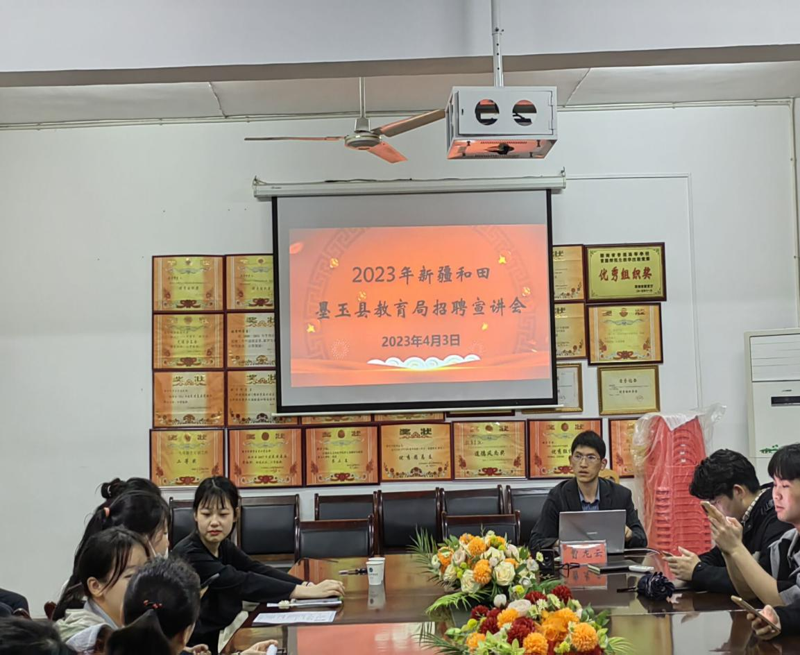 4月3日晚,2023年新疆和田墨玉县教育局招聘宣讲会于甘澍楼304举行。新疆和田墨玉县教育局招聘组曹龙云老师,教育学院党总支副书记田密,就业专干梁鑫,部分23届毕业生参加此次宣讲会。