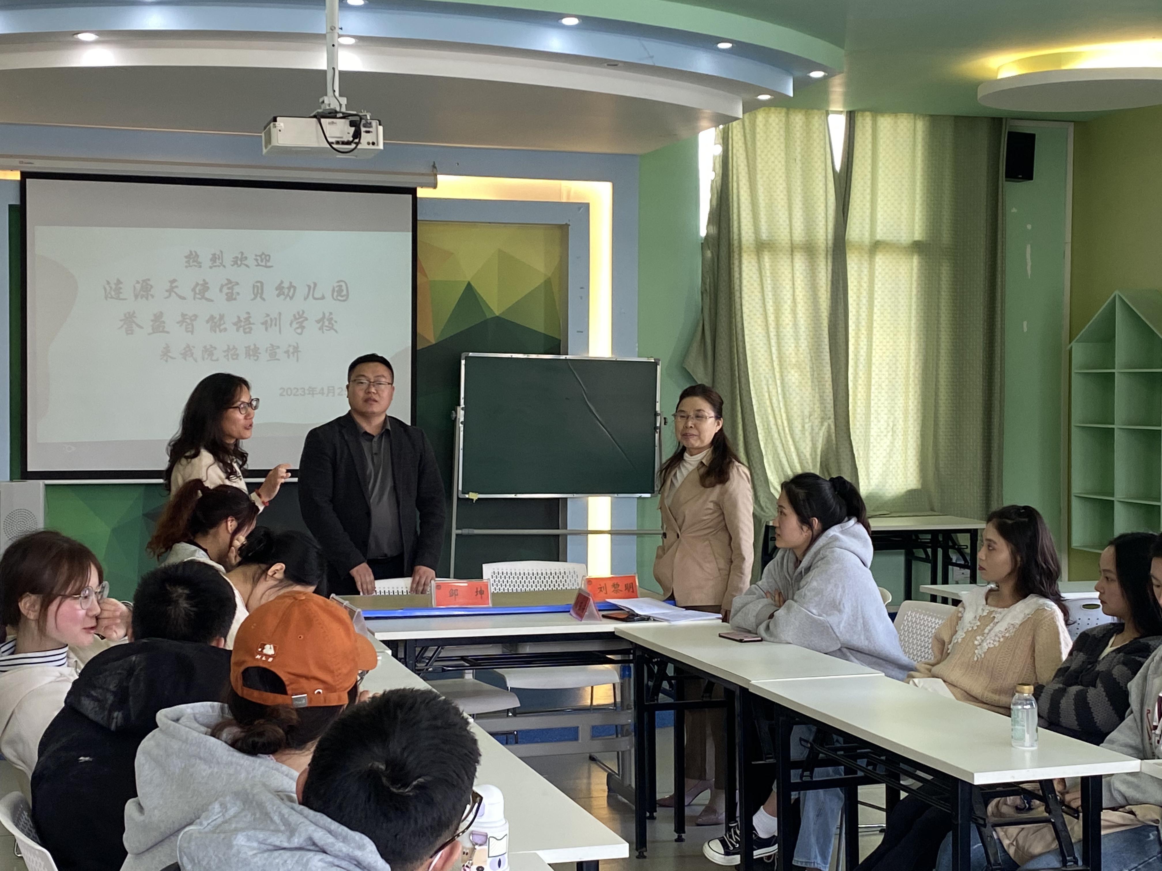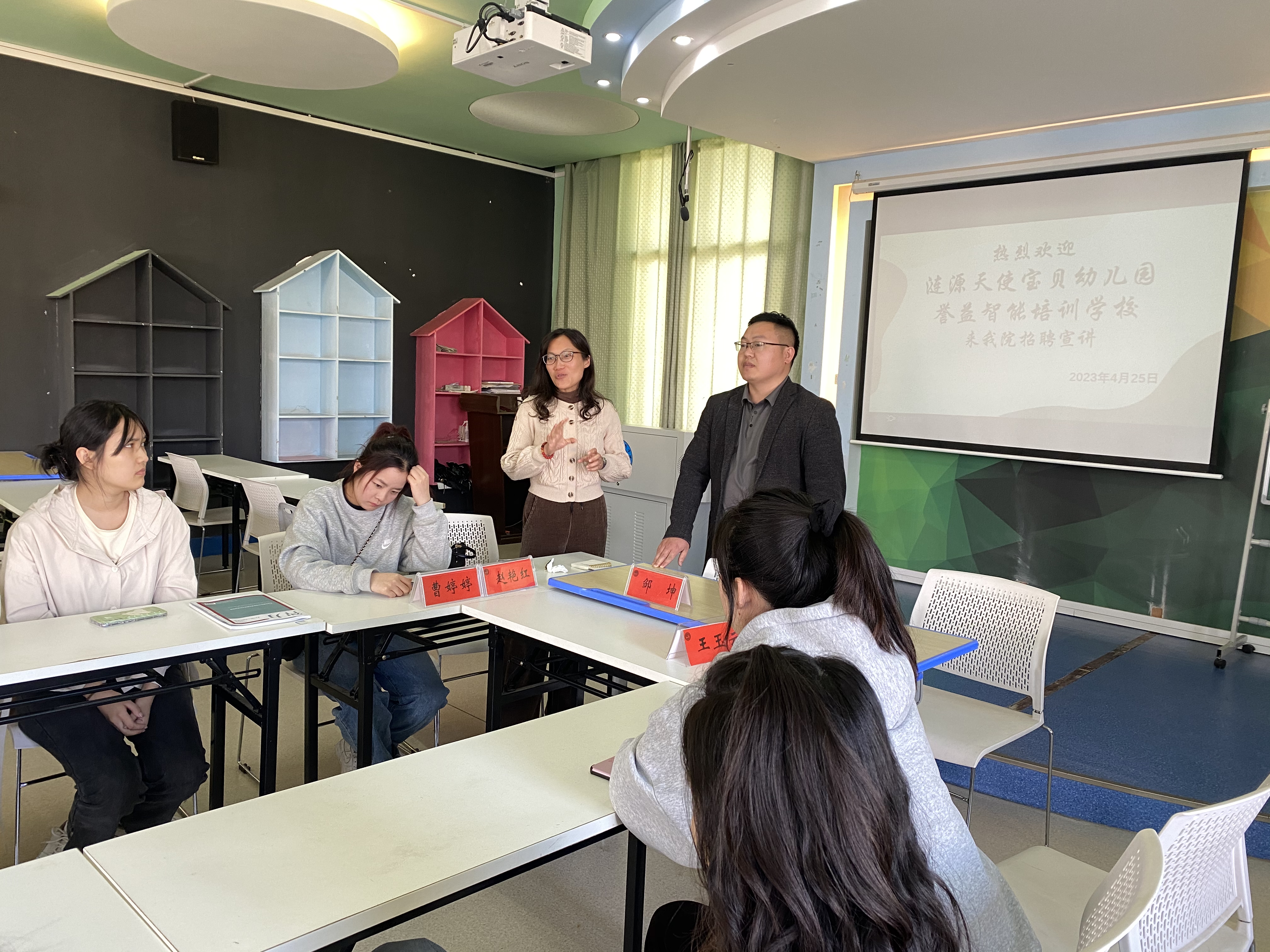 4月25日下午,教育学院在甘澍楼601举行2023年春季招聘宣讲会。参加此次招聘宣讲会的有湖南省涟源誉益智能培训学校负责人、涟源天使宝贝幼儿园负责人、教研室主任赵艳红、辅导员罗斯琪,毕业班班主任曹婷婷以及学前教育专业毕业生。